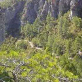 El camino cruza bajo cuevas de piedra y se sostiene sobre muros de contención, en un terreno casi abrupto, que le obliga a una curva tras otra, con empinadas pendientes en muchos casos. Cada vez nos menos más encajonados en una profunda hoz de escarpados laterales cubiertos de pinos.